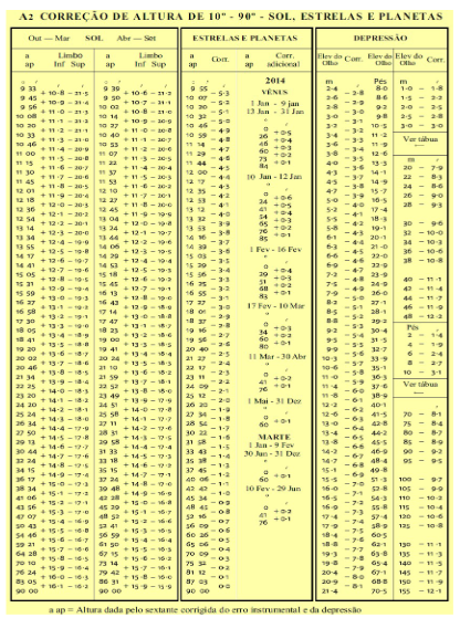 Às HMG = 15h 07m 45s desse mesmo dia, o Capitão observou o limbo inferior do Sol na Passagem Meridiana e obteve a altura instrumental (AI) de 42° 11,3'. Sabendo que seu olho durante a observação estava com uma elevação de 2,9 metros em relação ao nível do mar, o Capitão calculou a altura verdadeira (AV) do astro, tendo obtido