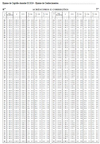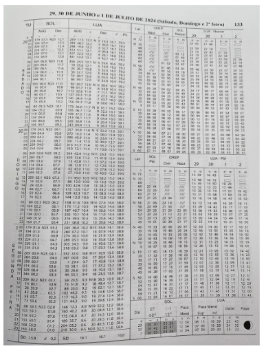 No dia 30 de junho de 2024, um Capitão-Amador, navegando de Florianópolis com destino a Fortaleza estava nas proximidades de Santos e preparou-se para determinar com seu sextante (erro instrumental igual a – 0,3’) a posição do seu iate na Passagem Meridiana do Sol. Para isso, ainda de manhã, calculou alguns parâmetros aproximados do Sol no momento da culminação, considerando estar, durante esse evento astronômico, na posição estimada Latitude 24° 22’,0 S e Longitude 045° 38’,0 W. Baseado na situação descrita para o dia 30 de junho de 2024 e nos demais dados apresentados no corpo das perguntas nos anexos do Almanaque Náutico, responda da 1ª à 6ª questões, assinalando a opção correta.