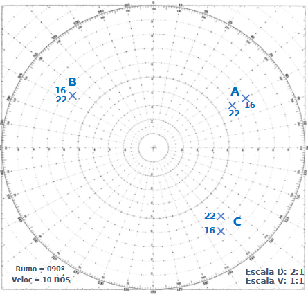 O veleiro “Langdon” navega no rumo 090°, velocidade 10 nós e opera um radar com apresentação estabilizada, North Up, na escala de 24 milhas, com 4 milhas entre os anéis de distância. A situação ilustrada na Figura abaixo mostra a posição de três alvos plotados numa Rosa de Manobra nos minutos 16 e 22, na escala de distância de 2:1 e na escala de Velocidade de 1:1.